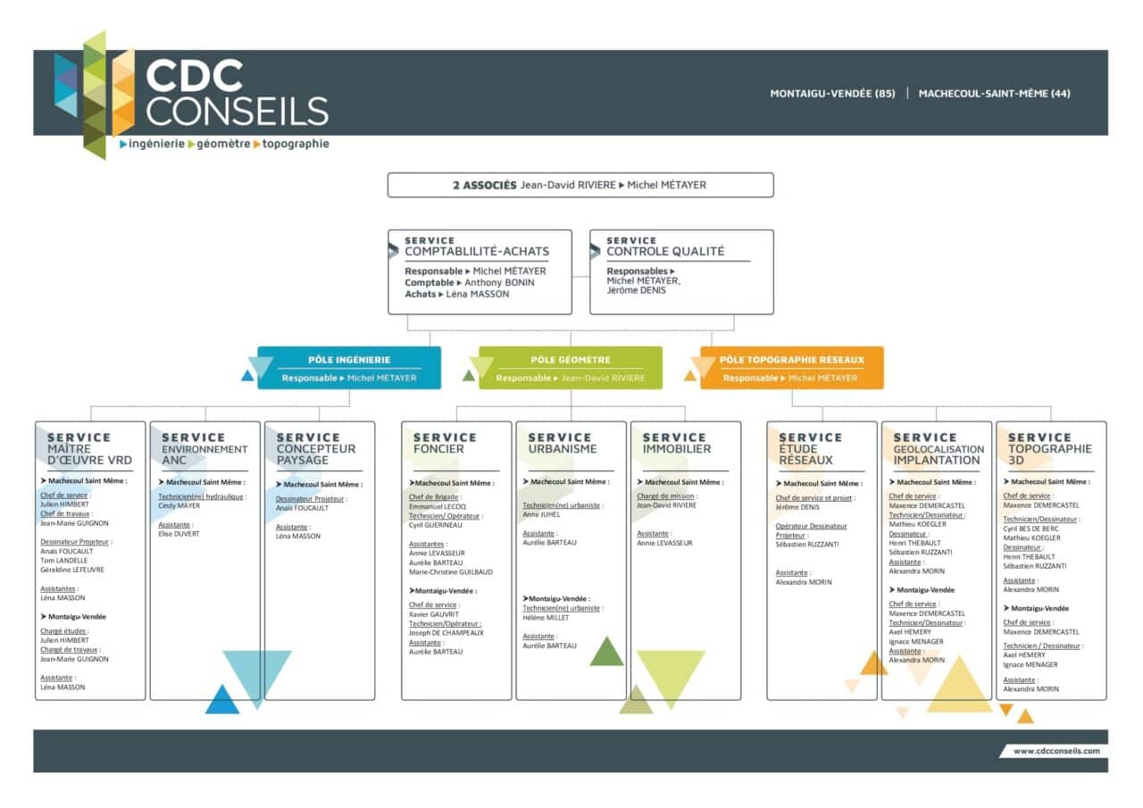 Forte d’une équipe de près de 35 collaborateurs, la société CDC Conseils s’articule autour de 3 pôles composés de 3 services chacun, et est présente sur 2 sites.